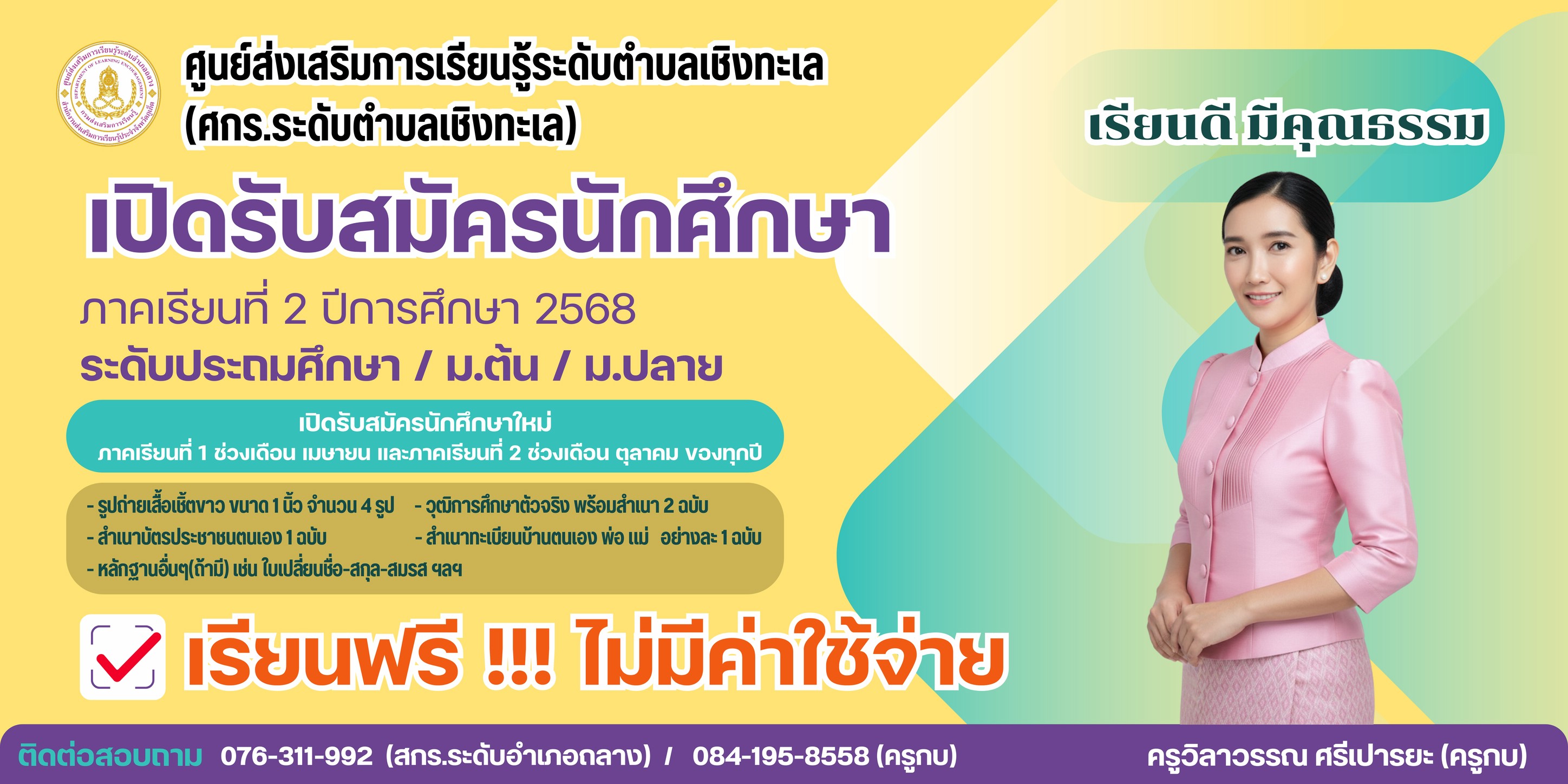 ศกร.ระดับตำบลเชิงทะเล เปิดรับสมัครนักศึกษาใหม่ ประจำภาคเรียนที่ 2 ปีการศึกษา 2568 ตั้งแต่บัดนี้เป็นต้นไป